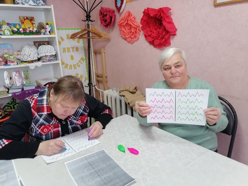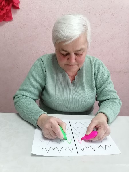Получатели социальных услуг с большим интересом выполняют новые увлекательные упражнения: рисуют одновременно двумя руками, запоминают и воспроизводят детали рисунка, представленного на экране, дорисовывают рисунки по клеточкам. Подобранные упражнения стимулируют работу обоих полушарий головного мозга, что способствует улучшению памяти, внимания и мышления пожилых людей.